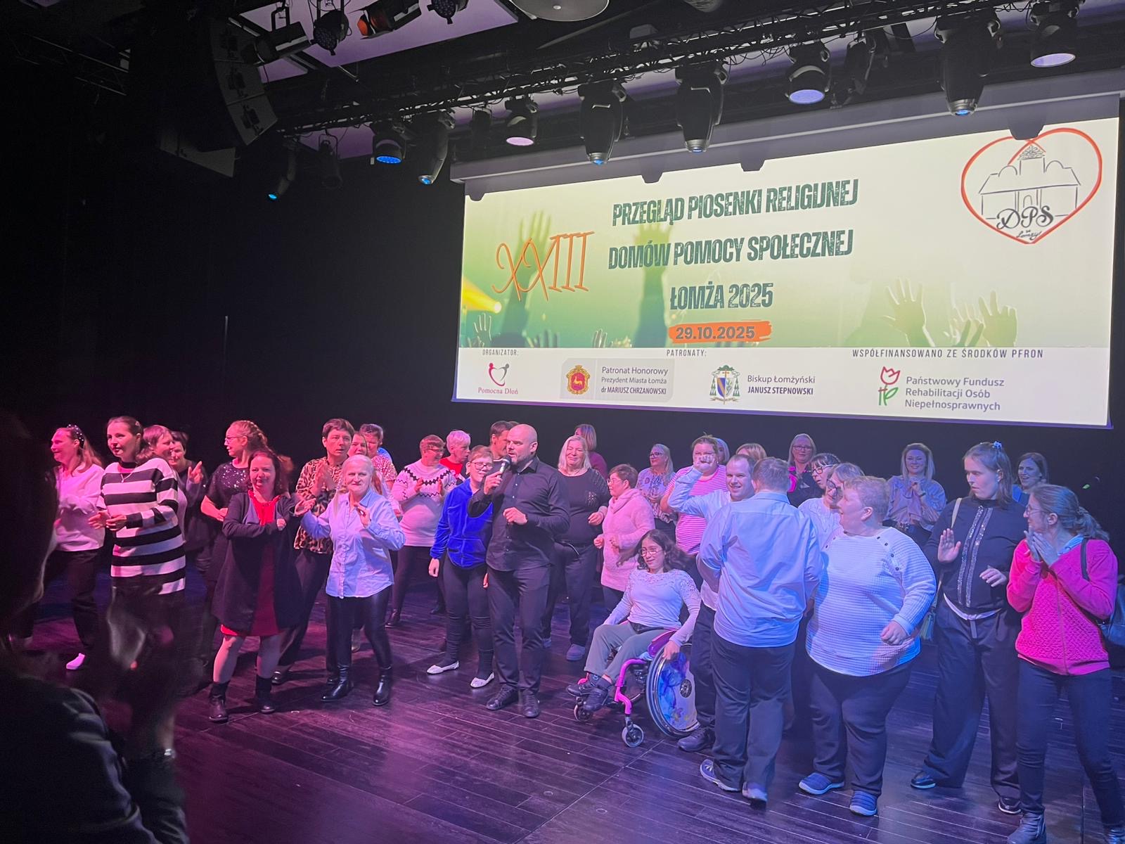 29 października 2025 r. w Hali Kultury w Łomży odbył się XXIII Przegląd Piosenki Religijnej Domów Pomocy Społecznej Łomża 2025. Wydarzenie zostało zorganizowane przez Stowarzyszenie Przyjaciół Dzieci i Młodzieży Niepełnosprawnych Intelektualnie „Pomocna Dłoń” przy DPS w Łomży. Spotkanie zainicjował występ wokalny głównego prowadzącego. Następnie wystąpił Krzysztof Jankowski Dyrektor DPS w Łomży. Wśród artystów znalazło się 26 zespołów zarówno z Domów Pomocy Społecznej jak i Środowiskowych Domów Samopomocy z województwa podlaskiego. W przeglądzie artystycznym wzięła udział również reprezentantka Oddziału Podlaskiego PFRON Urszula Kierznowska, która w imieniu Edyty Kondzior Dyrektora Oddziału złożyła gratulacje i podziękowania Zarządowi Stowarzyszenia i Dyrekcji DPS w Łomży z okazji organizacji wydarzenia, życząc jednocześnie wszystkim artystom powodzenia oraz udanych występów.