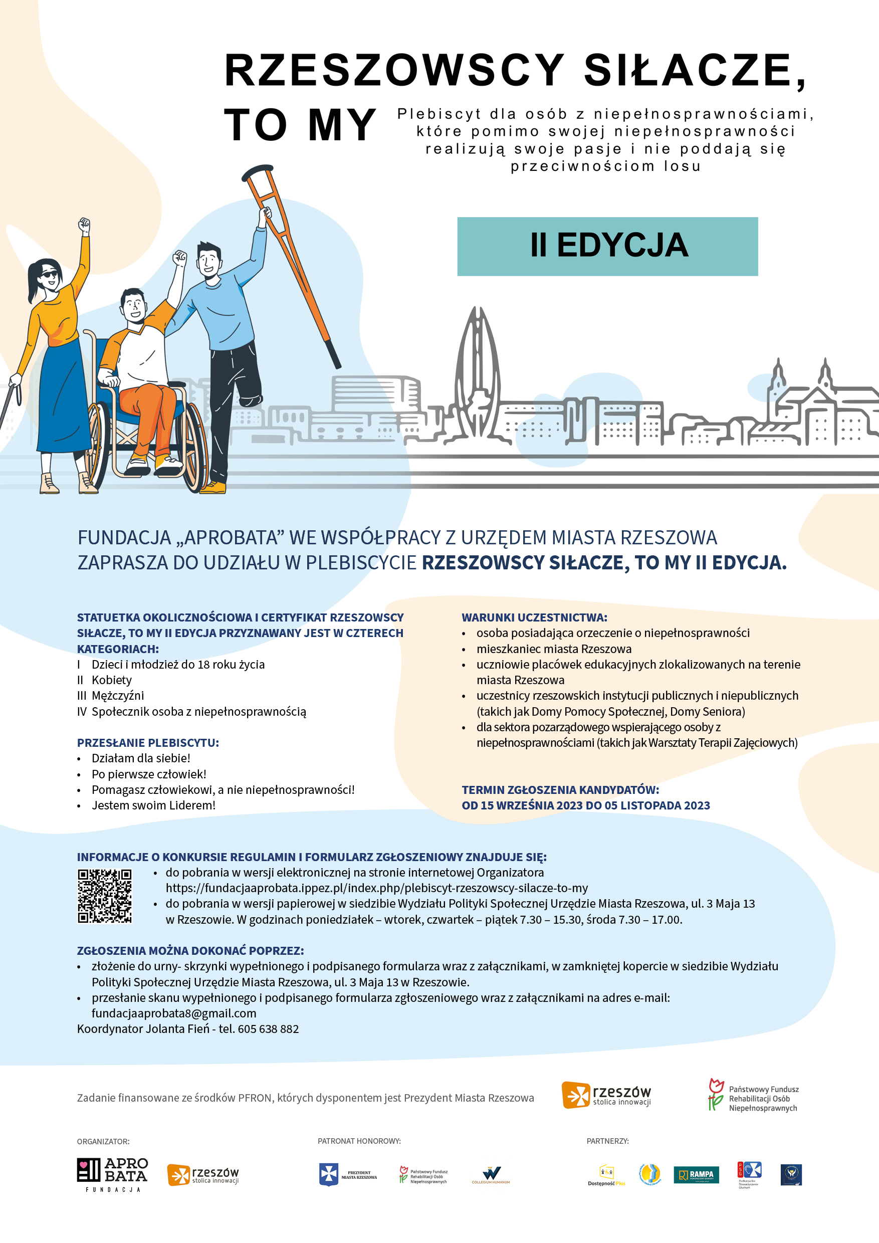 Plebiscyt realizowany jest przez Fundację ,,APROBATA’’ we współpracy z Urzędem Miasta Rzeszowa - projekt „Dofinansowano z budżetu Miasta Rzeszowa’’. Rzeszowscy Siłacze, to MY, jest II edycją wspaniałego wydarzenia pokazującego świat osób z niepełnoprawnościami, a w roku 2023r. realizowanego w ramach Kampanii Społecznej „Jestem swoim Liderem – ty bądź swoim”.