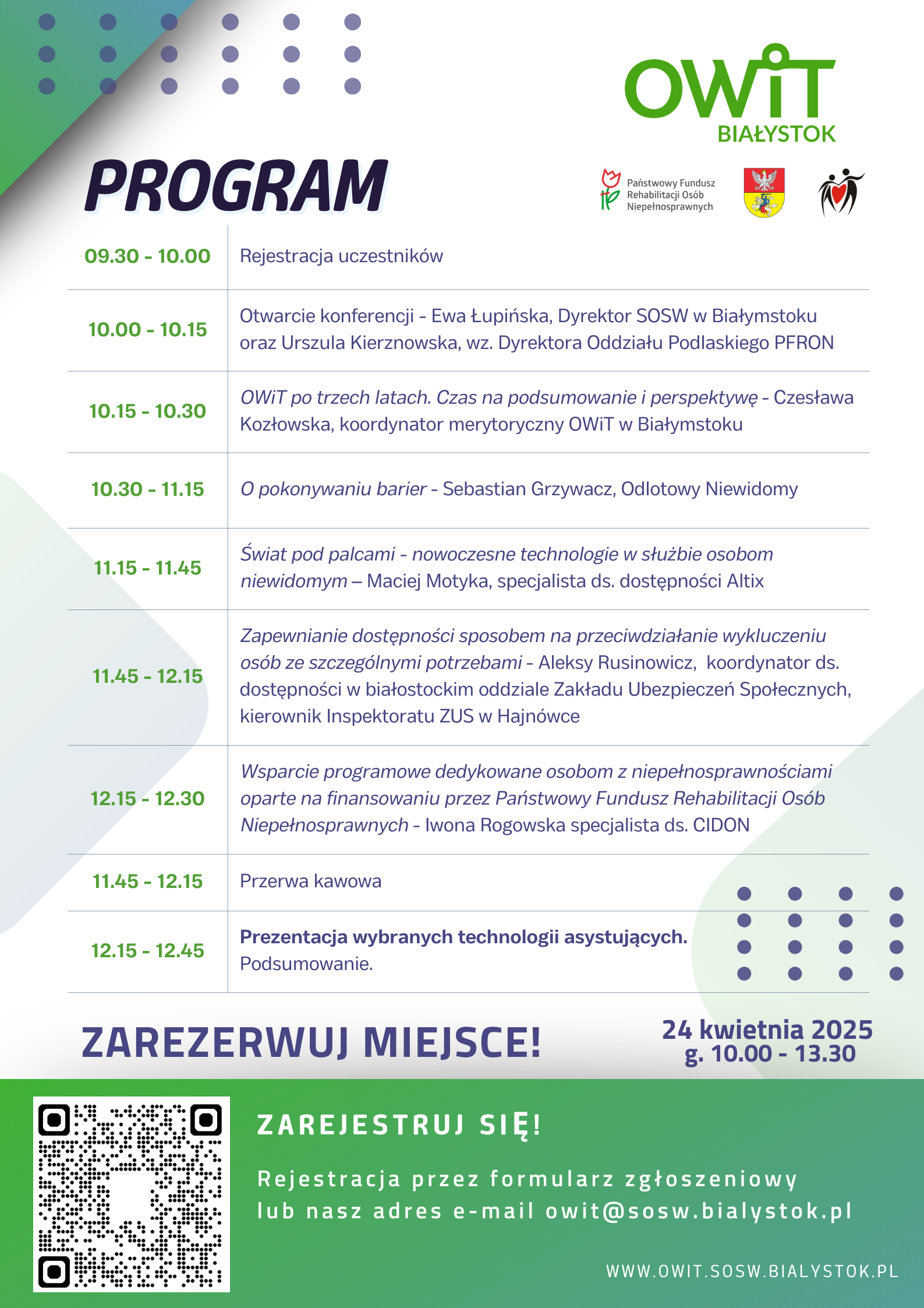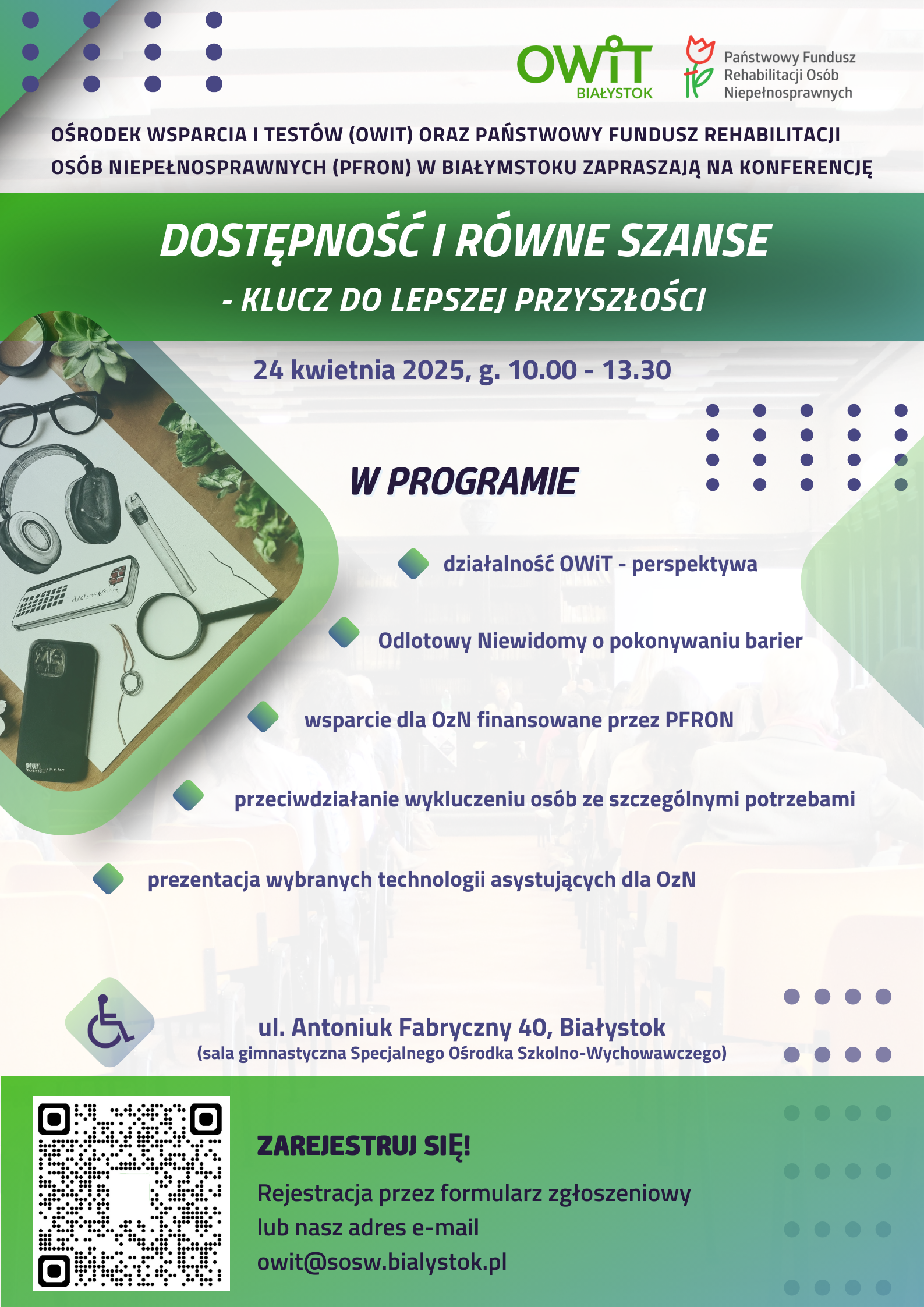 Oddział Podlaski Państwowego Funduszu Rehabilitacji Osób Niepełnosprawnych wraz ze Specjalnym Ośrodkiem Szkolno-Wychowawczym im. Waldemara Kikolskiego w Białymstoku zapraszają na konferencję informacyjno-szkoleniową pt. "Dostępność i równe szanse - klucz do lepszej przyszłości" w ramach programu PFRON pn. "Centra informacyjno-doradcze dla osób z niepełnosprawnością".