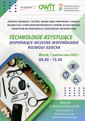 Oddział Podlaski Państwowego Funduszu Rehabilitacji Osób Niepełnosprawnych wraz ze Specjalnym Ośrodkiem Szkolno-Wychowawczym im. Waldemara Kikolskiego w Białymstoku zapraszają na konferencję szkoleniowo-informacyjną pt. „Technologie asystujące wspierające wczesne wspomaganie rozwoju dziecka”, organizowaną w ramach programu PFRON pn. „Centra informacyjno-doradcze dla osób z niepełnosprawnością”.