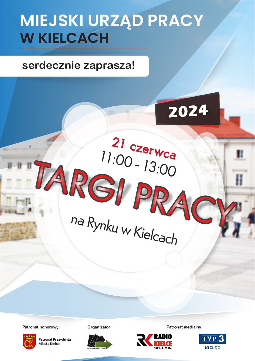 Miejski Urząd Pracy w Kielcach zaprasza na Targi Pracy które odbędą się w piątek 21 czerwca 2024 r. Rozpoczęcie Targów o godzinie 11.00 a zakończenie planowane jest na godzinę 13.00. Zapraszamy wszystkich, którzy poszukują pracy.