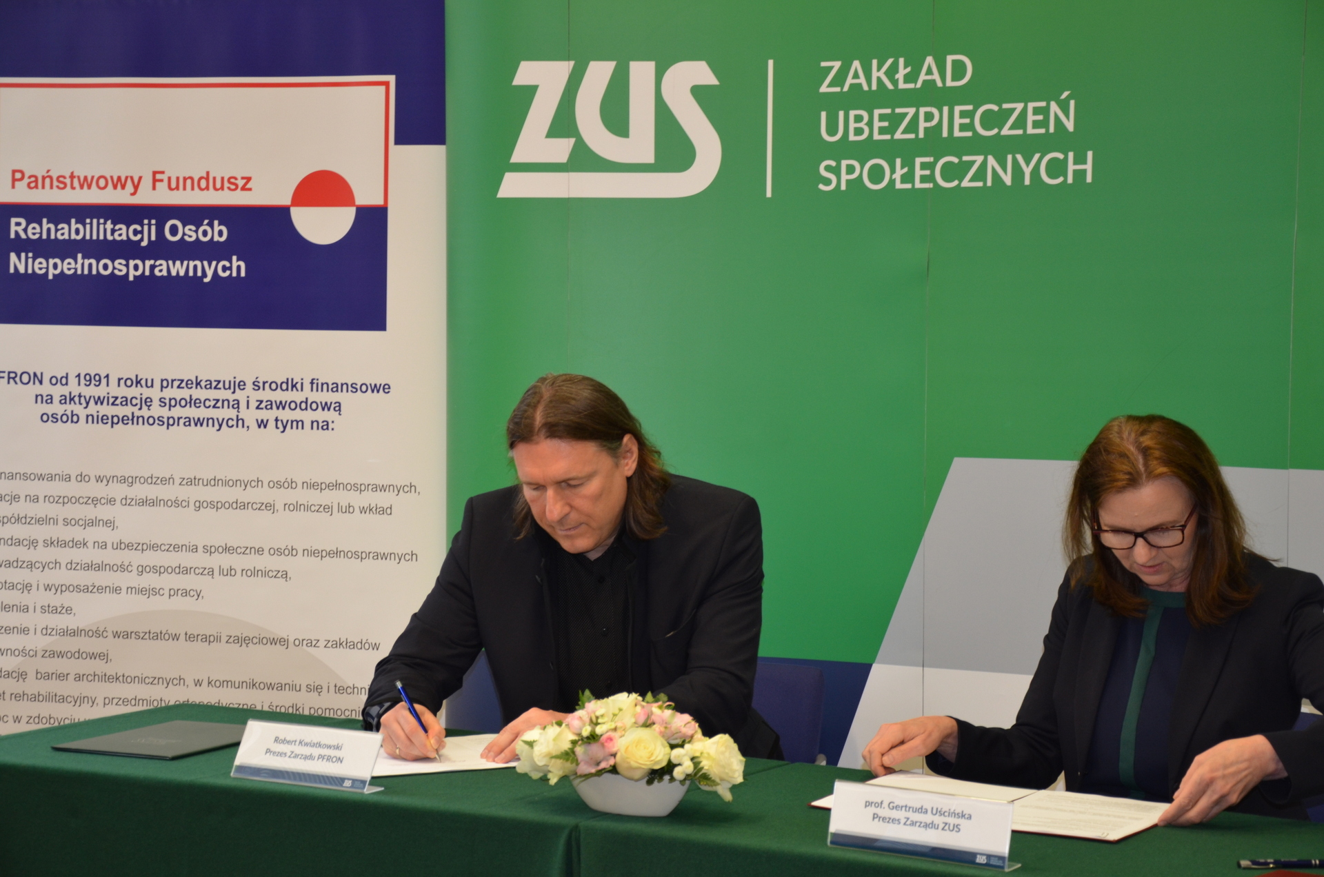 Prezes ZUS, prof. Gertruda Uścińska oraz Robert Kwiatkowski, Prezes Zarządu PFRON podpisali dzisiaj dwa niezwykle istotne społecznie porozumienia. Pierwsze o współpracy w przeciwdziałaniu wykluczeniu zawodowemu i społecznemu osób niepełnosprawnych, a drugie – o wsparciu finansowym dla ZUS w związku z planami zwiększenia zatrudnienia osób niepełnosprawnych. Porozumienie o współpracy podpisane zostało pod auspicjami Minister Rodziny, Pracy i Polityki Społecznej Elżbiety Rafalskiej oraz Krzysztofa Michałkiewicza, Pełnomocnika Rządu ds. Osób Niepełnosprawnych.